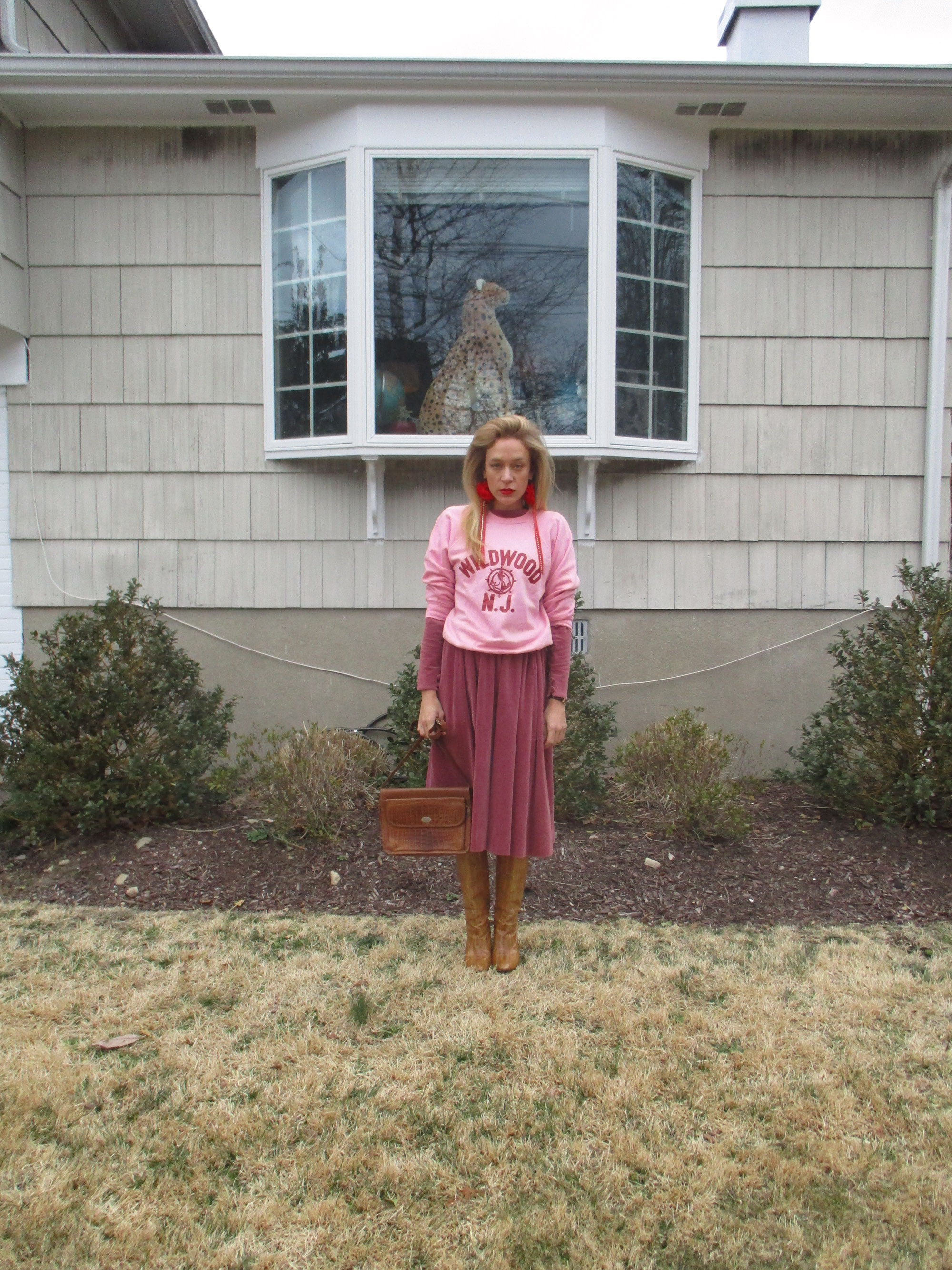 Dress by Laura Ashley, £95; Wildwood NJ sweatshirt, £250; vintage eelskin boots by Saffron, £80; vintage handbag by Gucci, £350; earrings, £5
