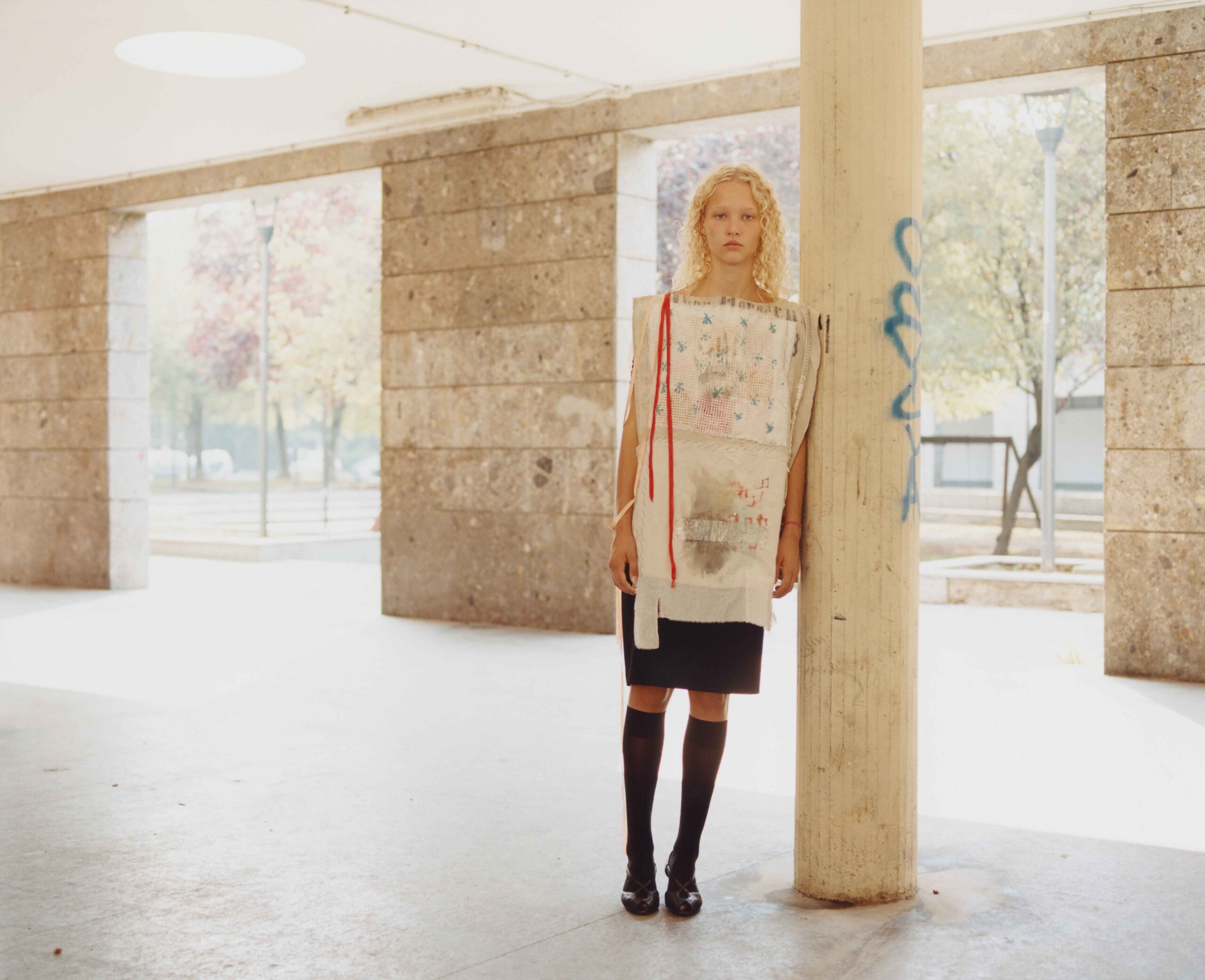 Poncho, £464, and ribbon, from RUN 12: God is a Jacket installation (2018), both by Susan Cianciolo. Leotard by Bloch. Vintage black skirt from Cavalli e Nastri. Socks by Wolford. Vintage shoes from Academy Costumes. Earrings by Slim Barrett