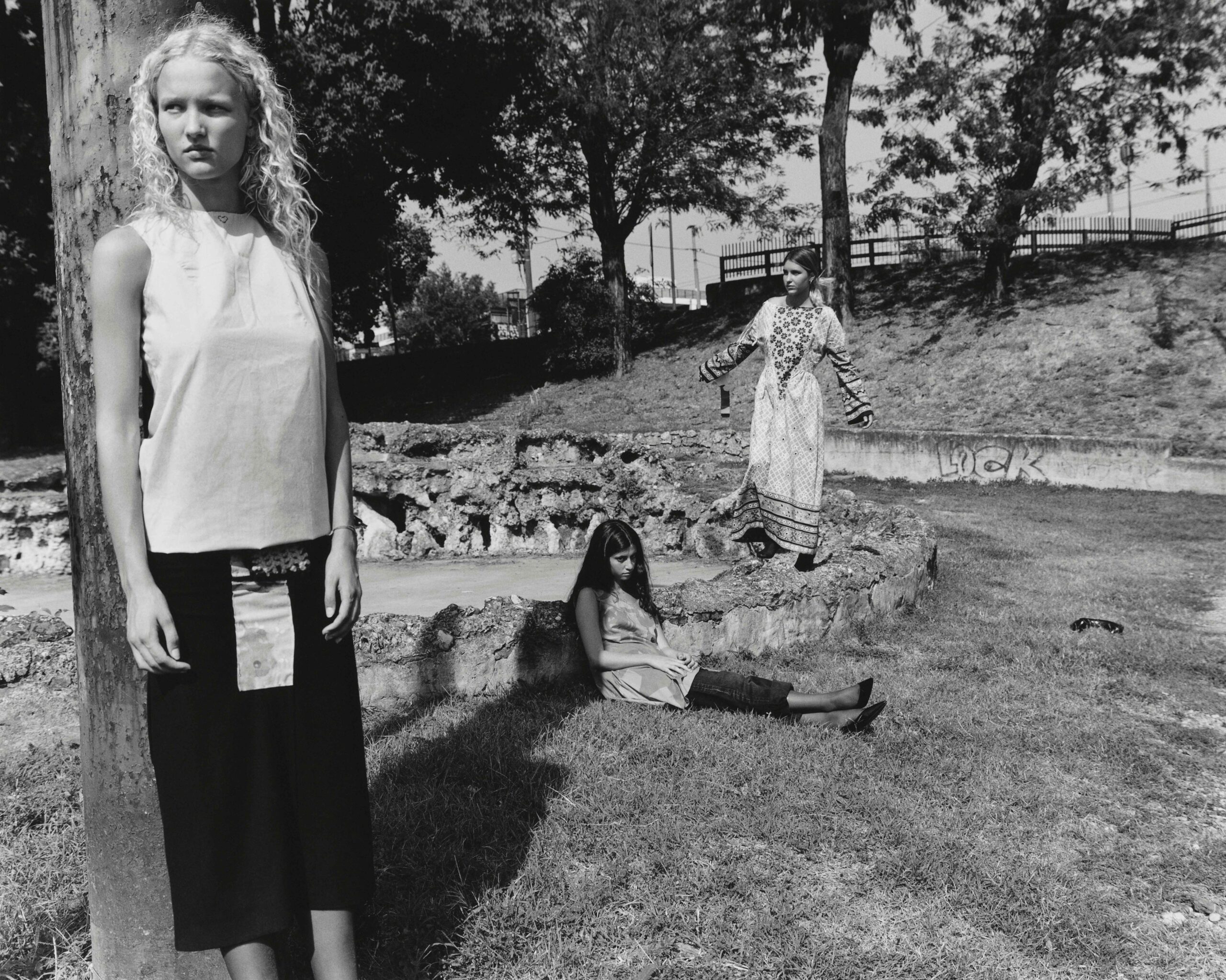 From left: pink top (2012), £773.50, and garment from RUN 12: God is a Jacket installation (2018), £3,867, both by Susan Cianciolo. Dress (1990), £3,093, and archive trousers (1999), both by Susan Cianciolo. Garment from RUN 12: God is a Jacket installation (2018), £3,867, by Susan Cianciolo. Socks by Wolford. Vintage shoes from Academy Costumes