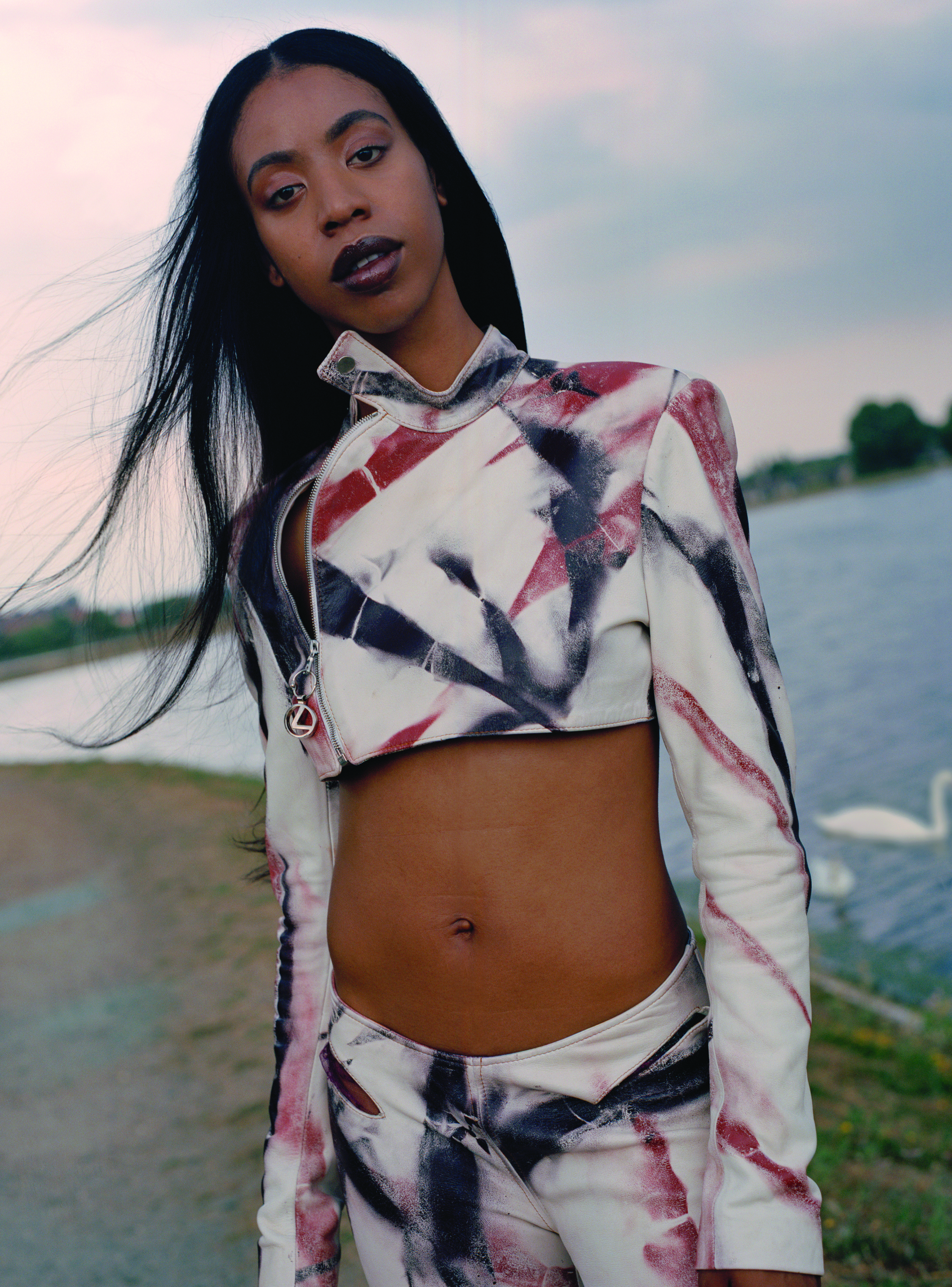 Mowalola Ogunlesi wears jacket, £650, and trousers, £550, both by Mowalola