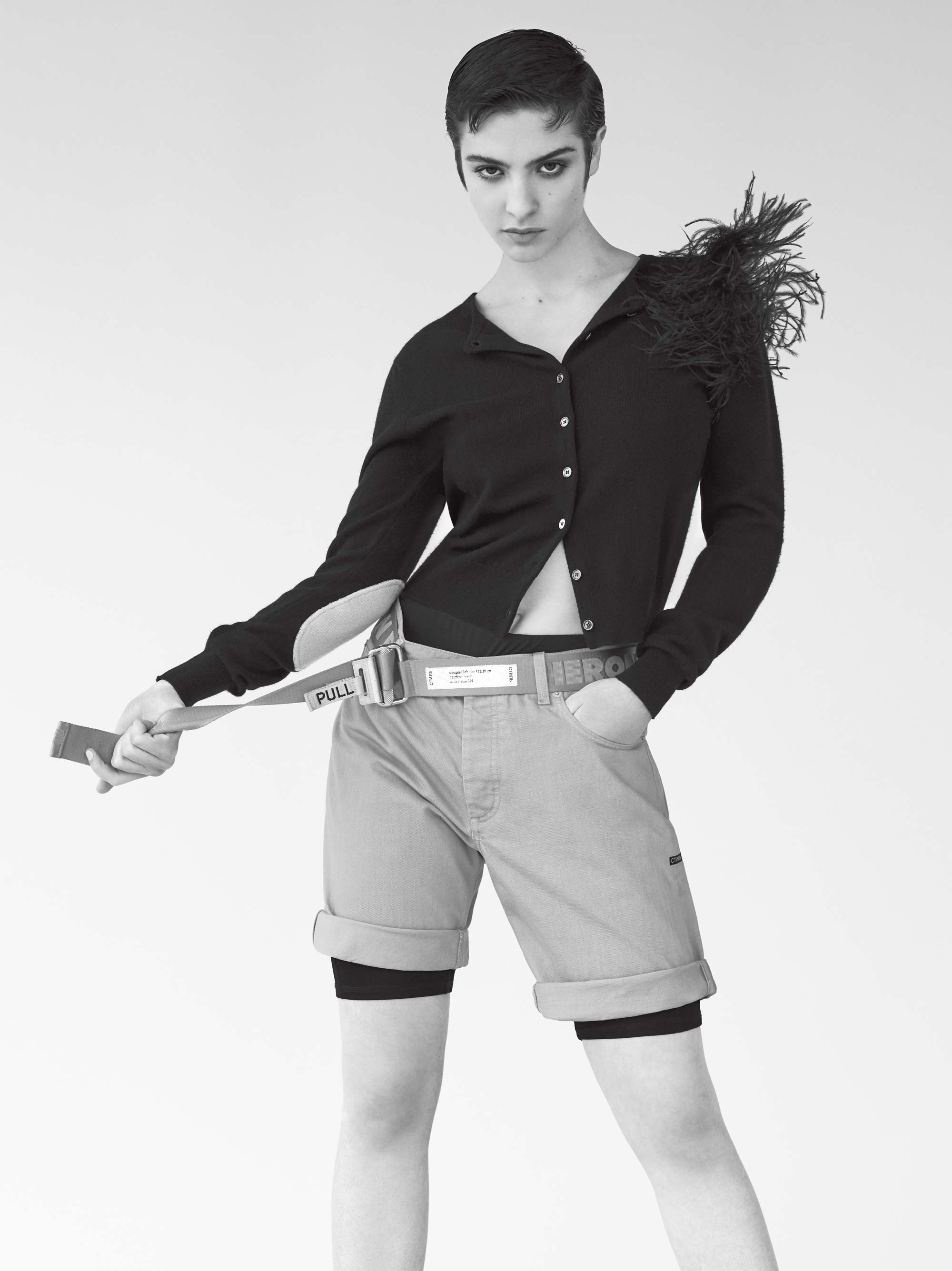 Shorts, £299, cycling shorts, £151, belt, £118, all by Heron Preston; cardigan by Petit Bateau, £54; gloves, stylist’s own; bra customised by stylist using feather trim, £14 per yard from M&J Trimmings.