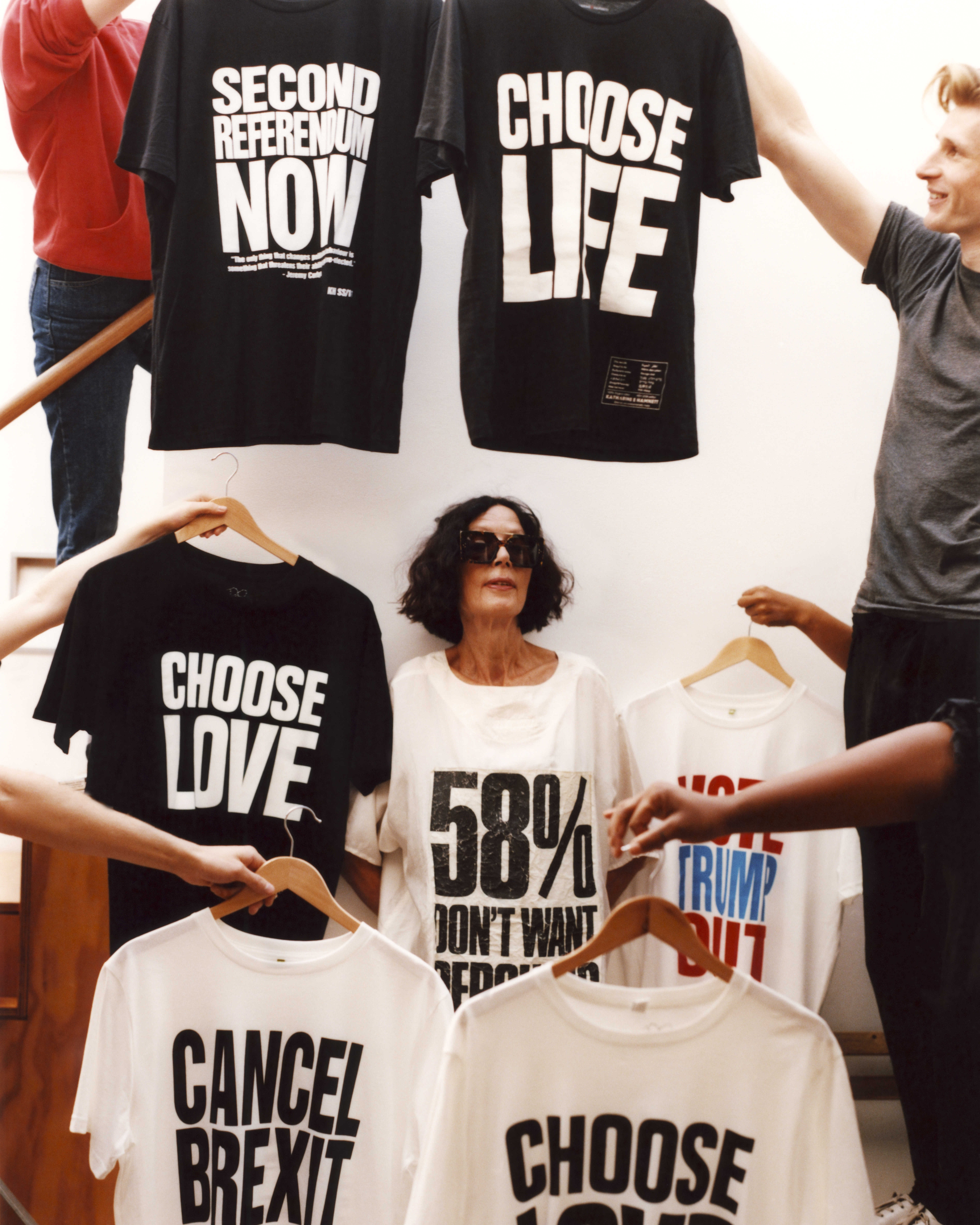 “In 1984, I got invited to a cocktail party with Margaret Thatcher, who I couldn’t stand. I wore my ‘58 Percent Don’t Want Pershing’ T-shirt under my office clothes and flashed it at the cameras as I was shaking her hand. Pershing missiles were a contentious political issue at the time and the photos went global. The ‘Choose Life’ T-shirt was the very first one that I did using the big lettering. I did a slew of ones like it, including ‘Use a Condom’, which Naomi Campbell wore on the catwalk. They were regarded as transgressional, but I didn’t have investors telling me not to ruffle people’s feathers or do things like our ‘Jail Tony’ T-shirt, for the illegal invasion of Iraq. That one got us into trouble!”