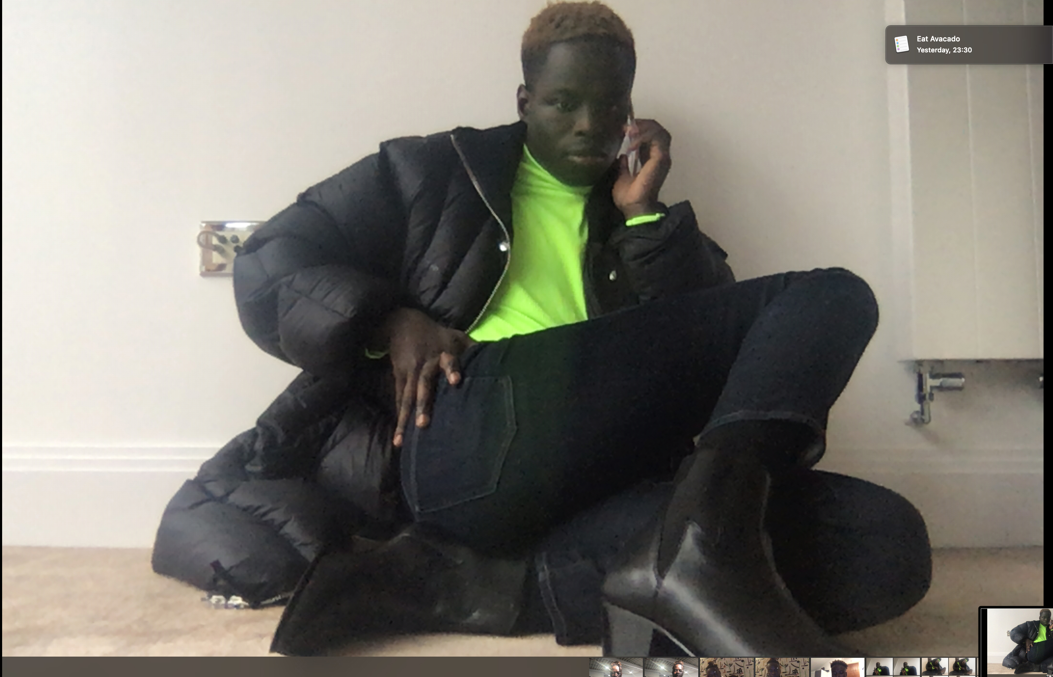 “I am trying out wearing colours again, so I am dressed in a neon-green jumper, with an Acne jacket, my four-year-old jeans and cuban-heeled boots. I have held on to them every winter, as it makes life easier when getting around.”