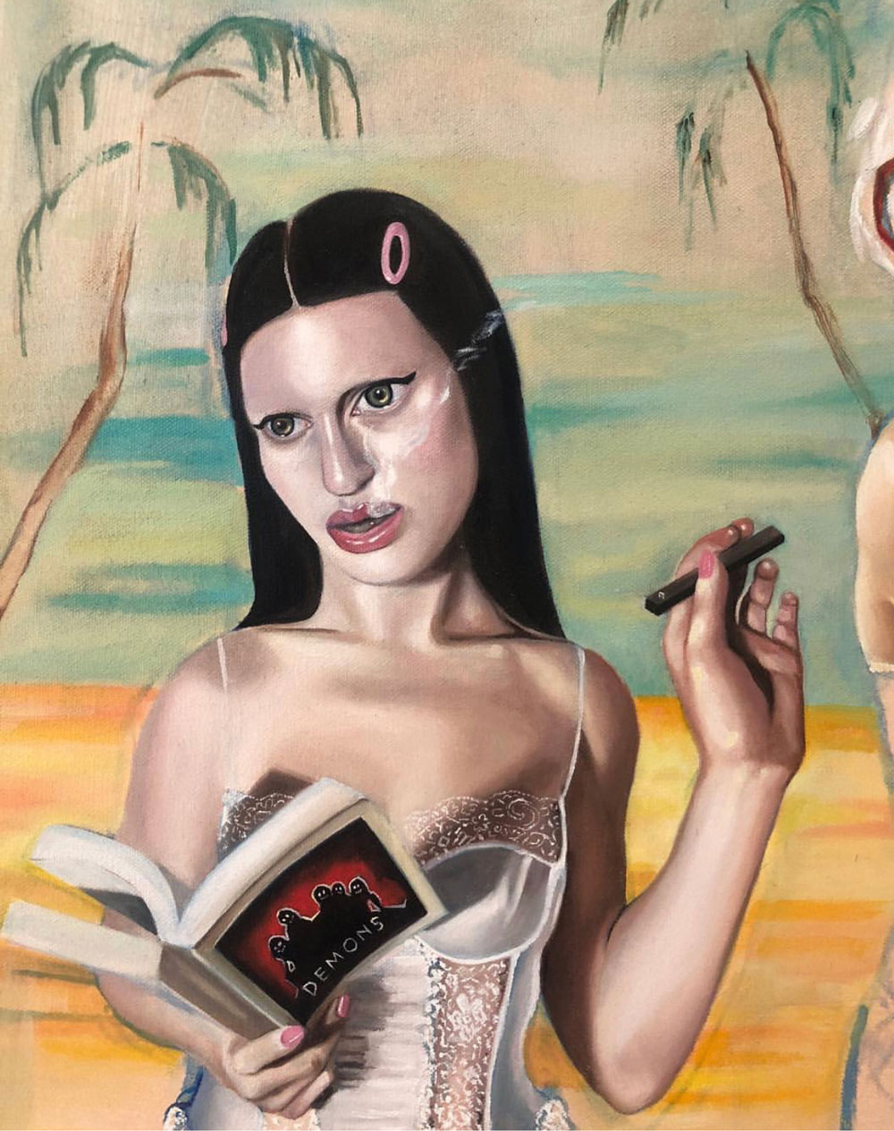 I feel as if I belong when I hear the sounds of birds and trees on the wind. A lot of my work is about a yearning for times long since past and the struggle between illusion and reality. In this painting, I depicted myself almost as an AI robot; the natural scene in the background is shown as merely a facade, like a backdrop in a theatre. So many of us, myself included, have forgotten its source and profound harmony with nature. We have all been thoughtless and blindsided by the products we consume and depend on, and need to change our frame of minds and our choices. What’s important, though, is to have the curiosity and openness to educate oneself on how to treat the planet with more awareness and positive intentions.”